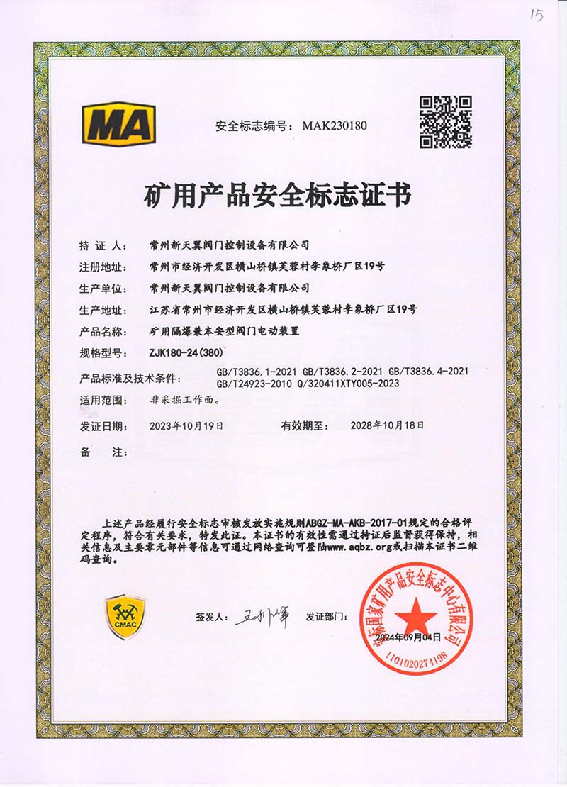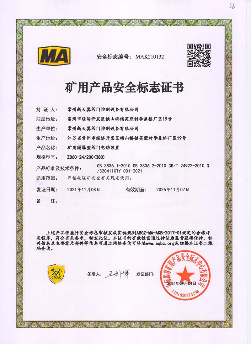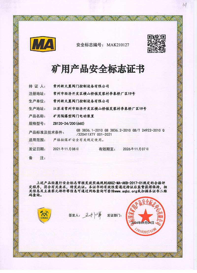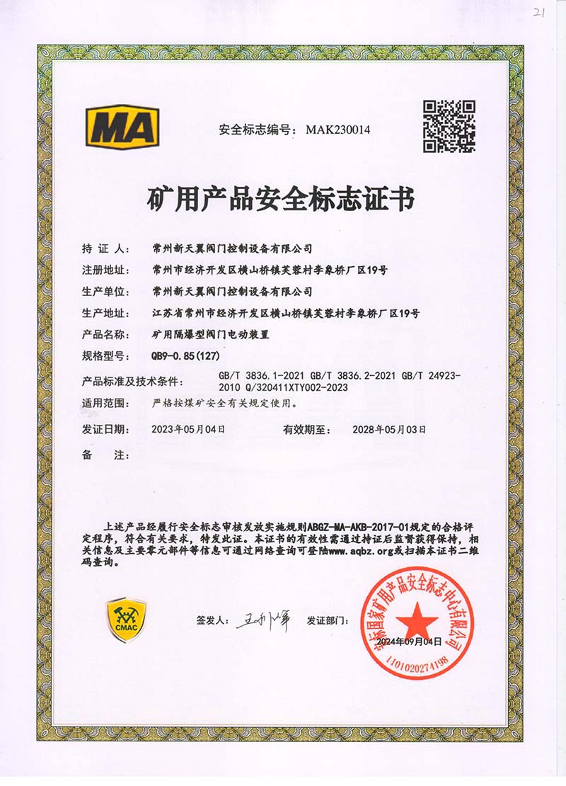 礦用隔爆ZB10-24中國國家強制性產品認證證書110.1
